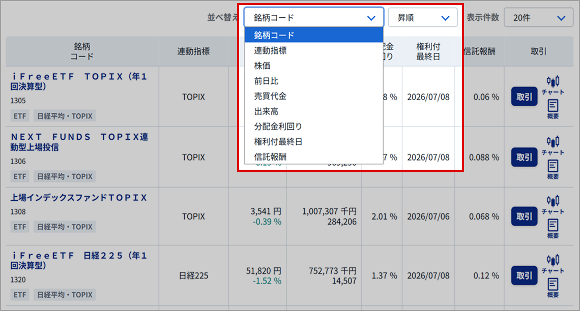 ETF・ETN取扱銘柄一覧では、投資判断に必要なデータをまとめて確認できます。