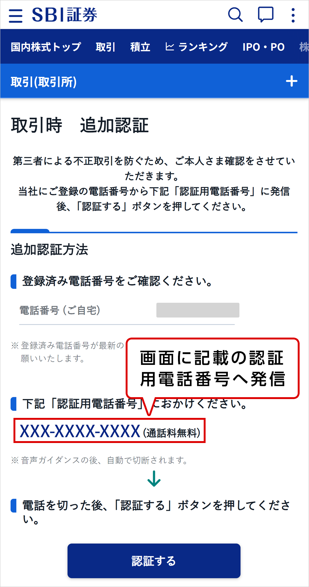 当社に登録の電話番号から、取引画面に表示される認証用電話番号へ発信いただくことで認証が完了します。