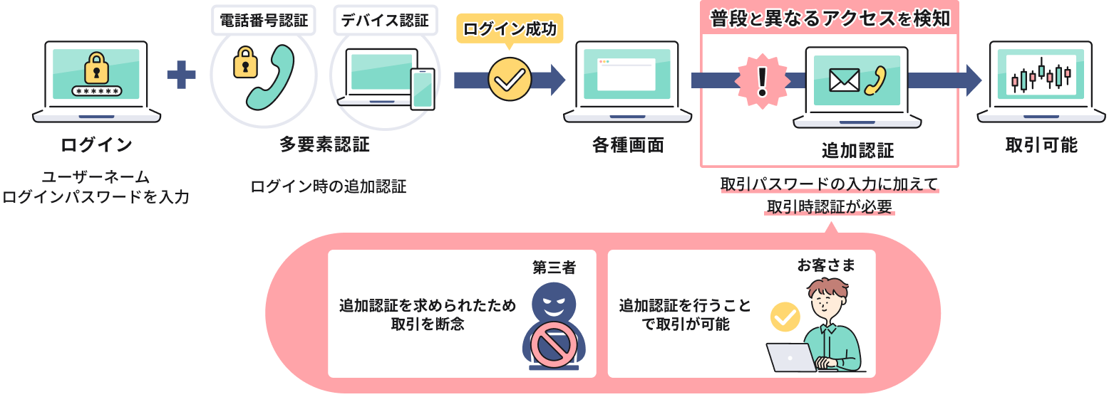 お客さまの資産の安全を確保するため、「普段と異なる」と判定された場合に追加認証を行います。