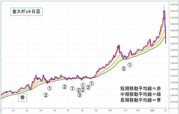 移動平均線大循環分析において中期移動平均線と長期移動平均線の間を「帯 (おび)」と言います。帯は大局トレンドの状態を示します。