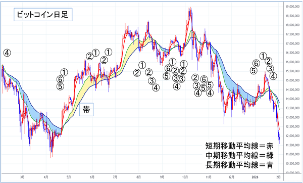 価格および短期移動平均線が帯の上にいるのが買い時代、帯の下にいるのが売り時代を表します。