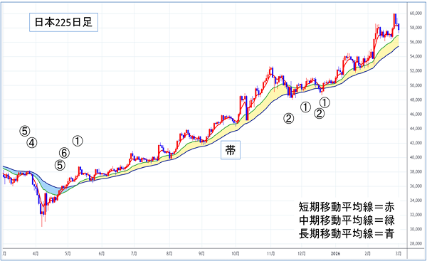 移動平均線大循環分析において中期移動平均線と長期移動平均線の間を「帯 (おび)」と言います。帯は大局トレンドの状態を示します。