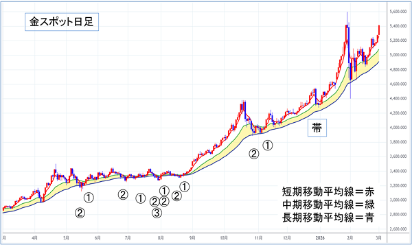 ・上昇トレンドに移行する場合は、短期移動平均線が帯を上抜けていきます。