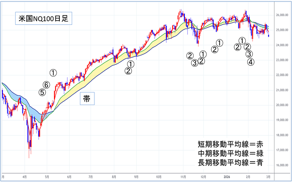 米国NQ100は下降期である第4ステージを維持しています。ここから帯に傾きが出て間隔が広がってくればトレンドに勢いが出てきます。一方で、短期移動平均線が帯に突入すれば下降相場の終焉である第5ステージへ移行します。