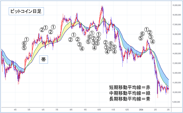 価格および短期移動平均線が帯の上にいるのが買い時代、帯の下にいるのが売り時代を表します。