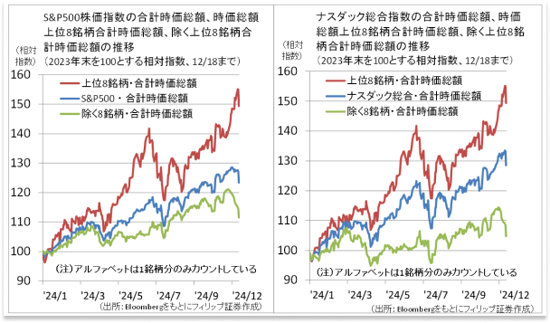 米国主要株価指数は、23年末から12/18終値までの騰落率を見ると、ダウ工業株30種平均株価が15.0%上昇したのに対し、時価総額加重平均型株価指数であるS&P500指数が23.1%上昇、ナスダック総合指数が29.2%と、相対的に高い。その要因として、時価総額上位銘柄への買い集中が挙げられる。S&P500指数とナスダック総合指数について、①「時価総額上位8銘柄合計」、②「それ以外の銘柄合計」の昨年末を100とする相対指数は、12/18終値で①が149.4に対し、②はS&P500指数が111.5、ナスダック総合指数が104.7となった。12/18に発表された米FOMC(連邦公開市場委員会)では利下げペースが鈍化するとの見通しが強まった。このため、時価総額上位銘柄への買い集中が変化する可能性もあるだろう。