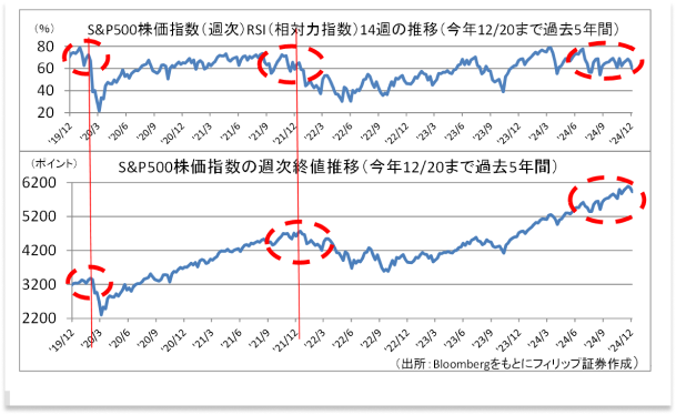 S&P500株価指数の週次終値推移では、過去14週間の上げ幅合計を、上げ幅合計と下げ幅合計を足した数字で割った「RSI(相対力指数)」が指数と似た動きとなりやすいが、その中でも過去5年間で2020年2月と2021年12月に指数が上昇基調から反転下落する転換局面の前に逆行現象がみられる。直近でも同様の逆行現象が確認されている。
