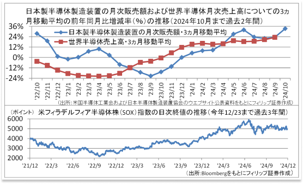 米国半導体工業会(SIA)が発表した9月の世界半導体販売額(3ヵ月移動平均)は、前年同月比23.2%増と11ヵ月連続で前年実績を上回り、前月(同20.6%増)を上回る伸び。また、日本半導体製造装置協会(SEAJ)による10月の日本製半導体製造装置(輸出を含む)の販売額(3ヵ月移動平均)は前年同月比33.4%増と、10ヵ月連続で前年実績を上回り、前月(同23.4%増)から伸び加速。半導体と半導体製造装置の直近の販売実績からは、半導体株の株価が再び上値を試す展開を期待する余地もあろう。