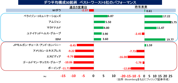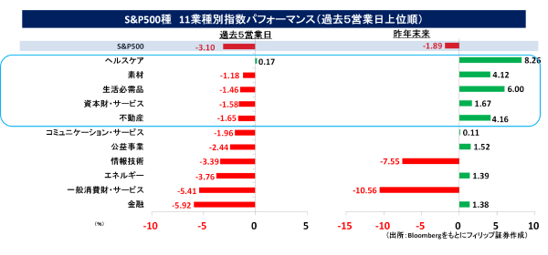 S&P500業種別およびダウ平均構成銘柄騰落率(3/7現在)