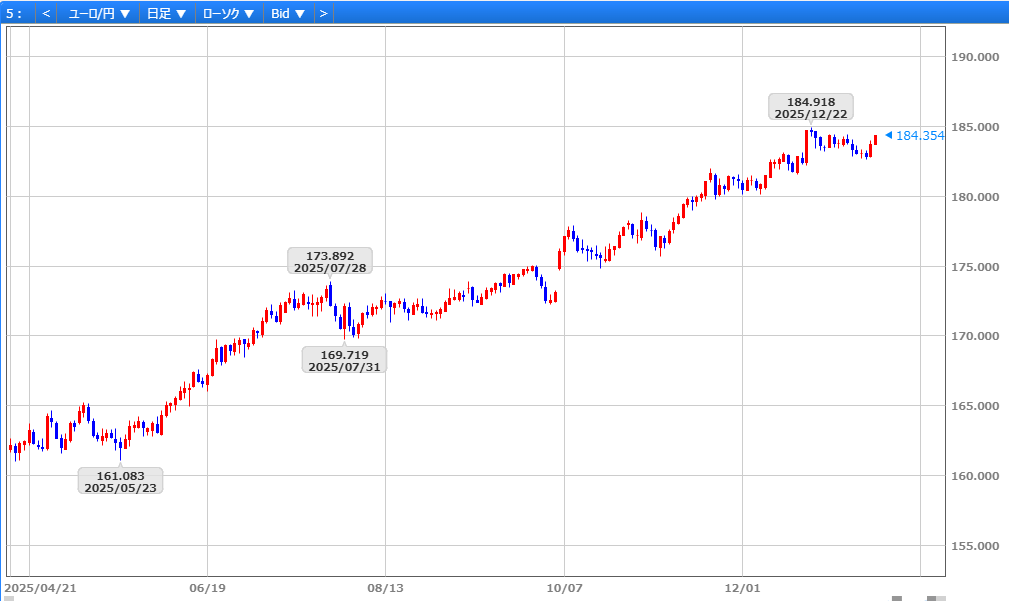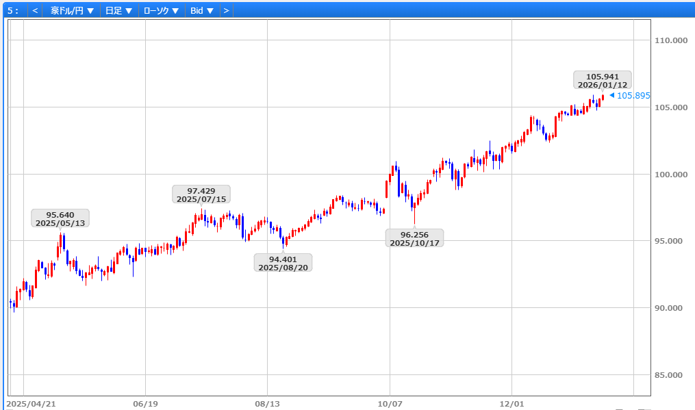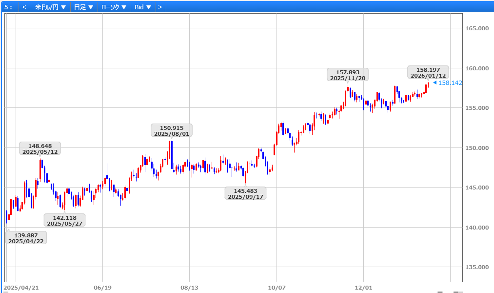 1/5発表の米12月ISM製造業景気指数が24年9月以来の低水準となり156円12銭へ下落しましたが、翌1/6には米サービス業PMI確報値の下方修正にもかかわらず、NYダウが史上最高値を更新したことで156円台後半へ反発。また、1/7発表の米12月ADPが弱含んだ一方、ISM非製造業景気指数の改善を好感し156円80銭へ上昇。1/8の日経平均株価の大幅安を受け反落に転じたものの、米新規失業保険申請件数や米貿易収支の改善を支えに157円台を回復。さらに1/9には日経平均の反発や日中関係悪化への警戒感が日銀の追加利上げ観測後退につながる中、157円台半ばへ上昇し、米12月雇用統計を無難に消化後も底堅く推移。こうした中、1/23の通常国会冒頭に衆議院を解散するとの観測報道やミシガン大1月消費者信頼感指数の上振れを受け、158円18銭へ急伸し157円89銭で取引を終えました。