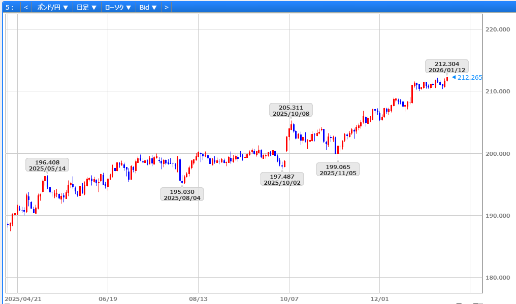ポンドドルは1/5の1.3414ドルを安値に、トランプ政権による1/3のベネズエラへの軍事攻撃や、グリーンランド取得への意欲など地政学リスクに対する英経済の底堅さとユーロの弱さとの違いが意識され、対ユーロでのポンド堅調とともに1/6には昨年9/18以来の1.3568ドルへ反発。ただ、1/7-8発表の米ISM非製造業景気指数、米新規失業保険申請件数や貿易収支改善を背景に1.3416ドルへ下落。さらに、1/9発表のミシガン大1月消費者信頼感指数の上振れに加え、この日予定されていた最高裁による関税政策の違憲性を巡る判断を1/14へ先送りしたことからドルが全面高となり1.3393ドルへ下落し1.3405ドルで取引を終えました。一方、ポンド円は1/5の210円43銭を安値に対ドルでの上昇とともに1/6に212円15銭へ上昇。ただ、1/8にかけて対ドルでの下落とともに210円32銭へ反落しましたが、1/9にはドル円が158円台へ急伸したことに伴い212円06銭へ反発し211円65銭で取引を終えました。