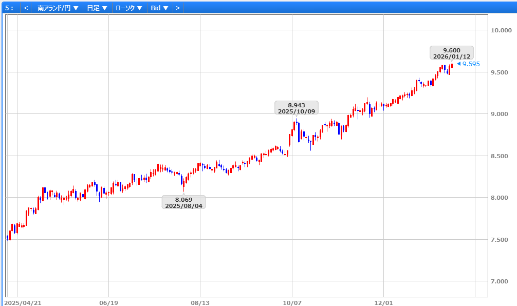 1/5の9円48銭を安値に、米国によるベネズエラへの軍事攻撃を背景に地政学リスクが高まり、南ア主要輸出品である金・プラチナ相場が1/6にかけて続伸。これを好感して南ア全株指数も史上最高値を更新し、ランドは対ドルで2022年8月以来の水準まで上昇、ランド円も9円58銭へ上伸。ただ、1/7-8にかけて商品相場や南ア全株指数の反動安に加え、11月製造業生産高や12月ABSA製造業PMIの低下を受け9円47銭へ反落。しかし、1/9にドル円が158円台へ上昇する円安基調を追い風に9円59銭へ切り返し、9円57銭で取引を終えました。