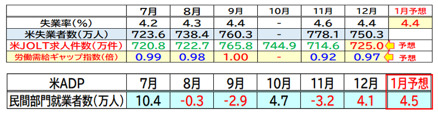 6日に発表される米1月雇用統計では、非農業部門就業者数が前月比6.8万人増と、12月から増加する見通しとなっています。雇用統計に先立ち発表されるJOLTS求人件数やADP全米雇用報告も小幅ながら改善が見込まれており、米労働市場の底堅さを確認する流れが想定されます。
