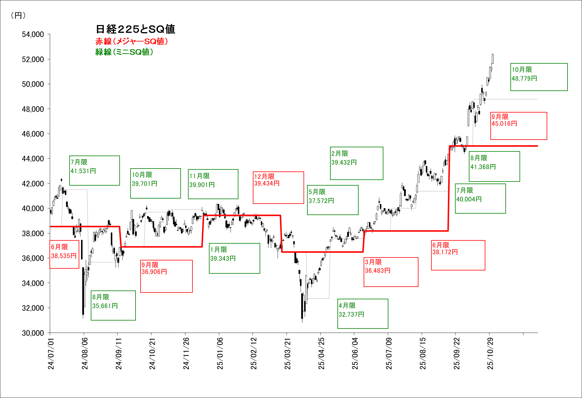先週(10月27日-31日)の日経225先物は、前週末比3,150円高の52,470円と大幅続伸。