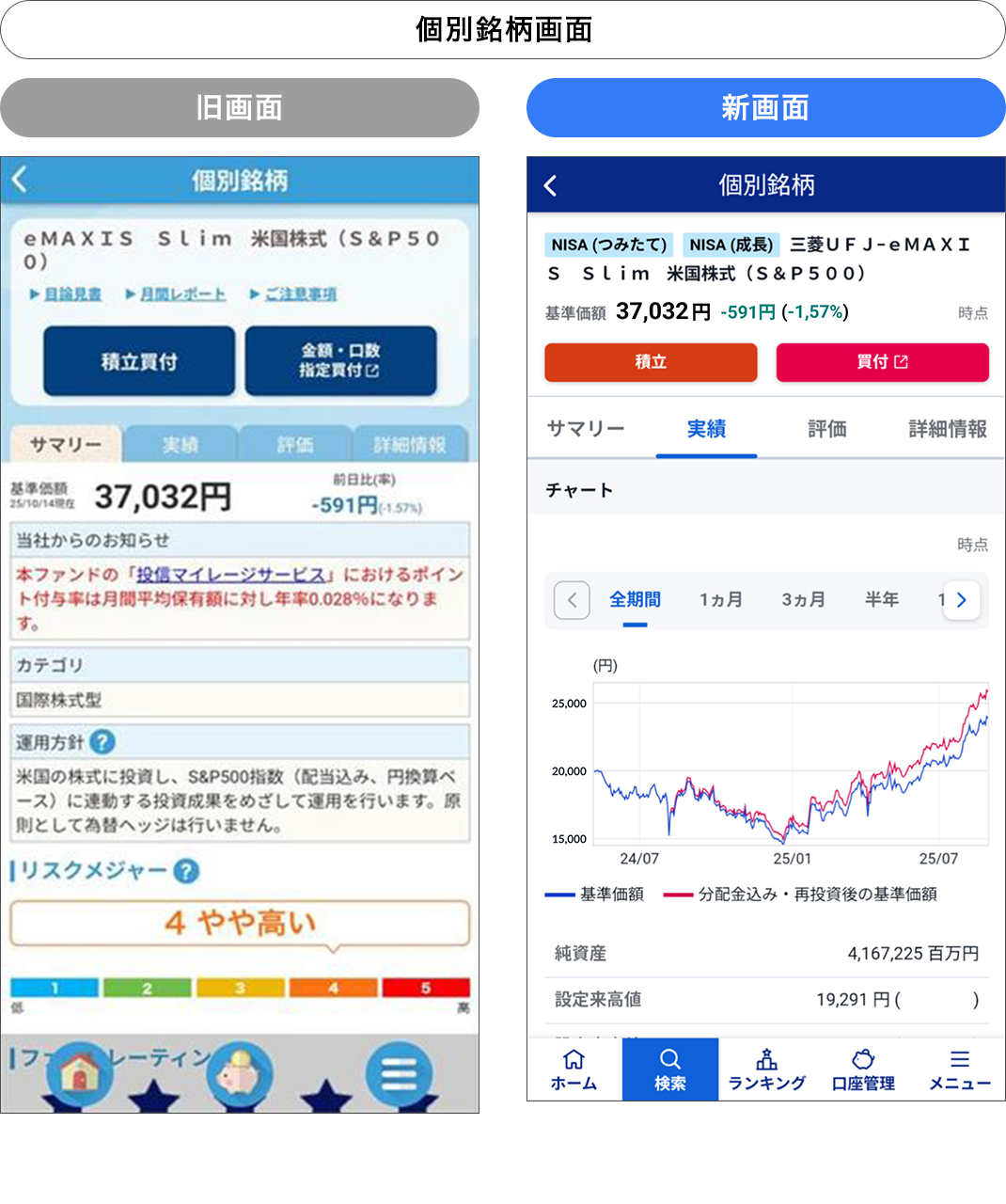 今回のリニューアルでは、「ホーム」「ランキング」「個別銘柄」「積立設定」などの画面デザインを刷新します。