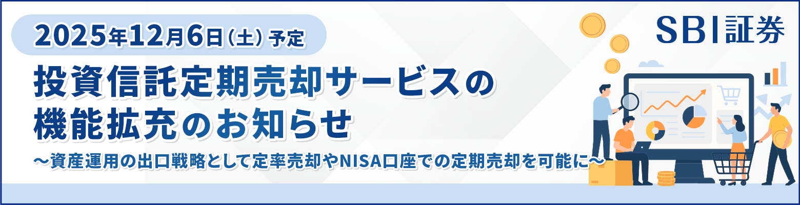 2025年12月6日(土)より、投資信託の定期売却サービスの売却方法に定率指定方式・期間指定方式を追加するとともに、NISA口座での定期売却設定を可能にする機能拡充の実施を予定しておりますので、お知らせいたします。