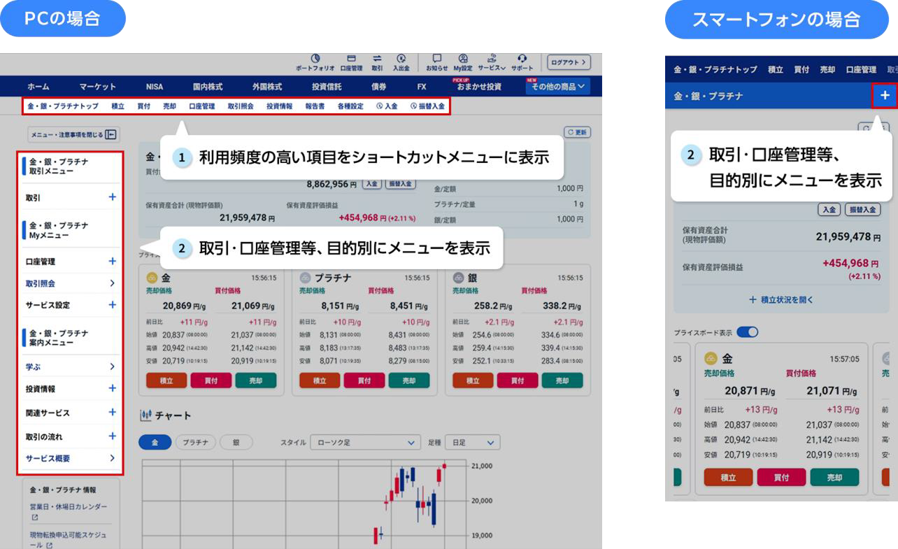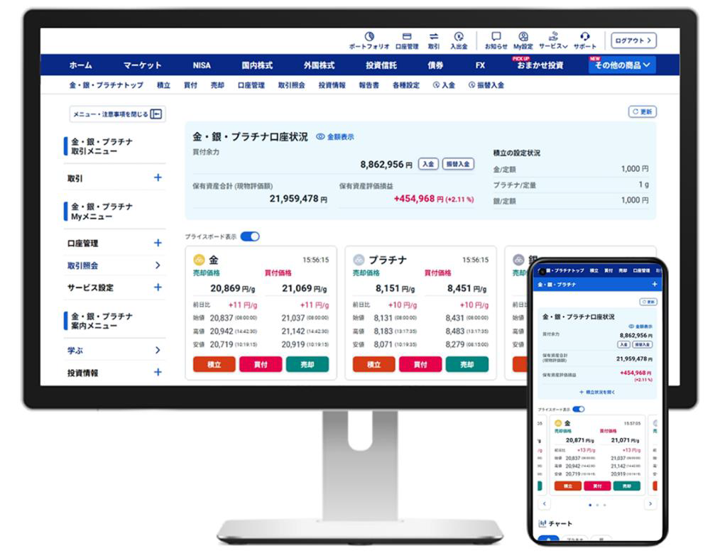 金・銀・プラチナ取引ページをメインサイトに統合することで、株式・投信など他の商品と同様の操作感でスムーズにご利用いただけるようになりました。