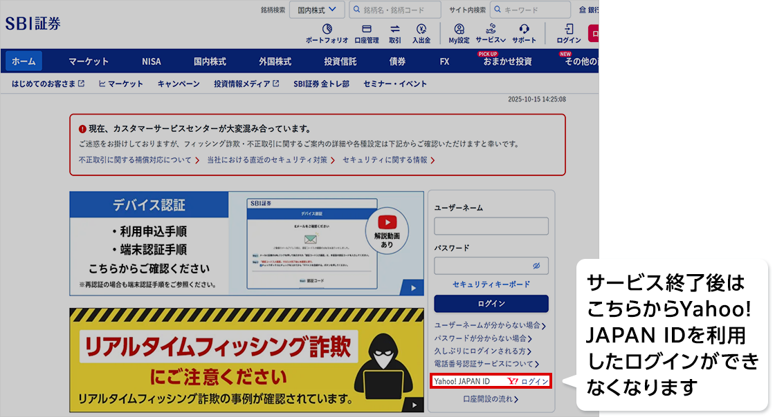 これにより、同日夕刻(予定)以降、Yahoo! JAPAN IDを利用したSBI証券WEBサイトへのログインができなくなります。