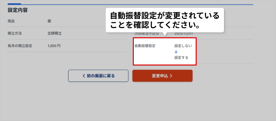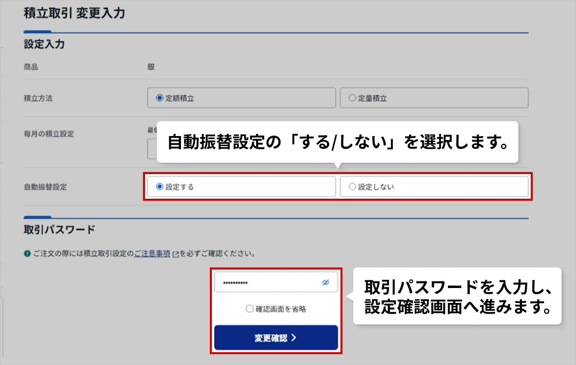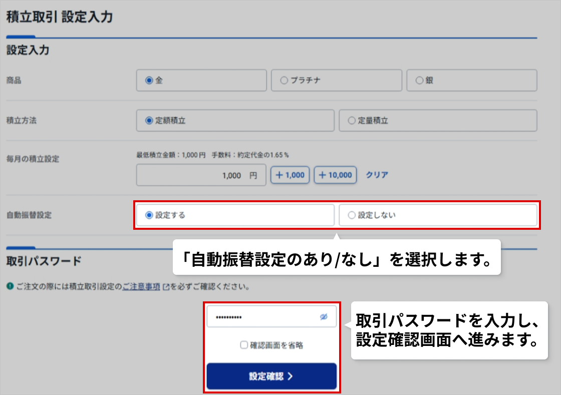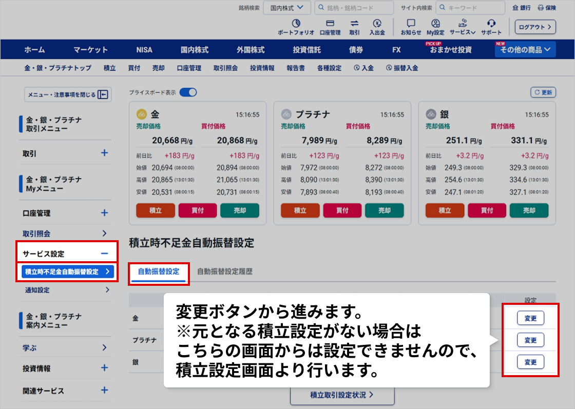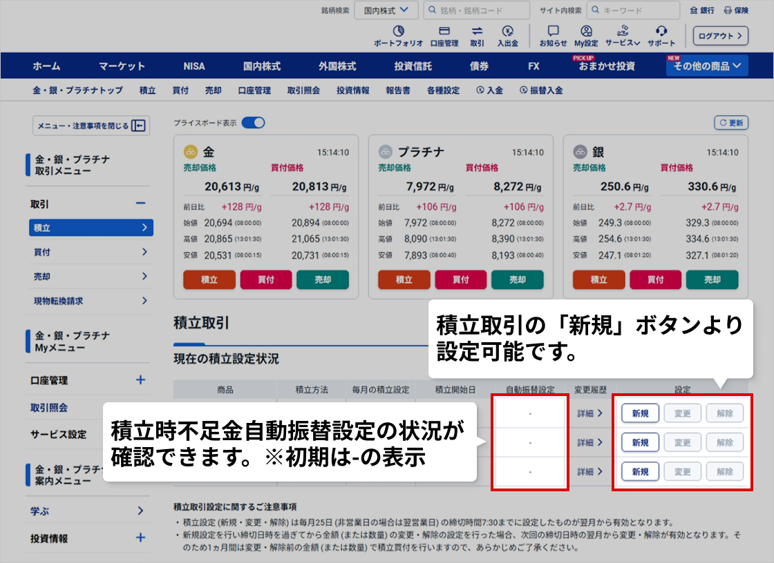 - ※金・銀・プラチナ取引口座内の設定画面等で、積立時不足金自動振替機能の「設定する」「設定しない」の切り替えが可能です。