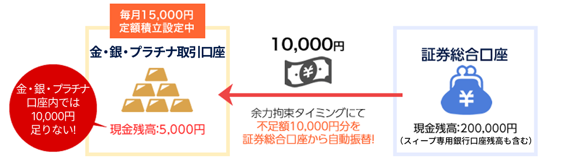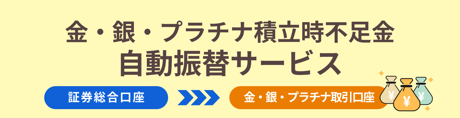 金・銀・プラチナの積立取引(定額積立取引/定量積立取引)に必要な現金が金・銀・プラチナ取引口座内の現金残高で補えない場合、証券総合口座内にある現金残高のうち出金可能額(信用取引口座を開設されているお客さまは委託保証金現金残高のうち出金可能額の範囲内)から必要額を自動で振り替えるサービスです!