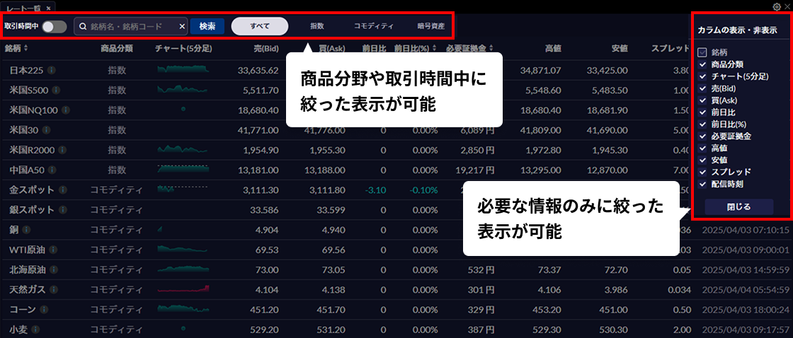 「店頭CFD取引サイト」では、トレンドラインの描画ができたり、画面をお客さま好みのレイアウトに設定できたりとアプリにはない機能も多数搭載しています。 店頭CFD取引サイトの魅力リアルタイムで配信されているレートを一覧表示することができる全銘柄のレートを一覧表示することができる「レート一覧」「レート一覧」は、全銘柄のレートを一覧表示することができる機能です。指数やコモディティ、暗号資産と商品分野に絞った表示や、取引時間中に絞った表示も可能です。表示させたいカラムは、右上の設定ボタンより変更ができるため、お客さまの必要な情報を選んで表示させることが可能です。