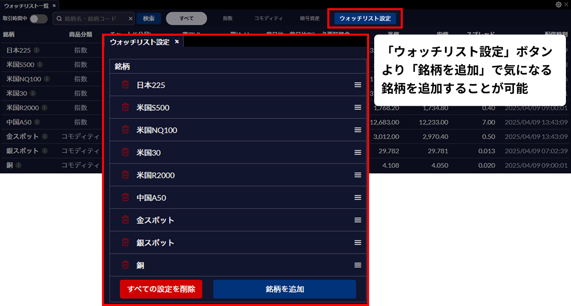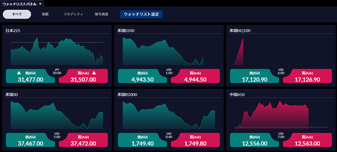 気になる銘柄に絞ってレートを一覧表示させることができる「ウォッチリスト一覧」「ウォッチリスト一覧」は、お客さまの気になる銘柄に絞ってレートを一覧表示させることができる機能です。表示させたい銘柄は、「ウォッチリスト設定」より設定できます。「レート一覧」機能と同様、指数やコモディティ、暗号資産と商品分野に絞った表示や、取引時間中に絞った表示ができ、右上の設定ボタンより表示させるカラムの変更も可能です。