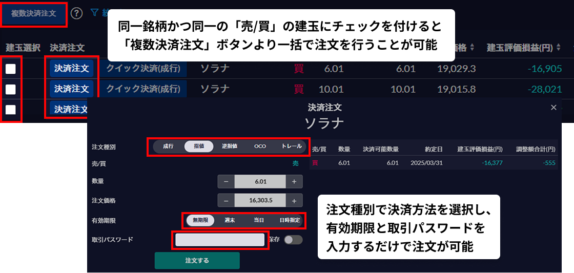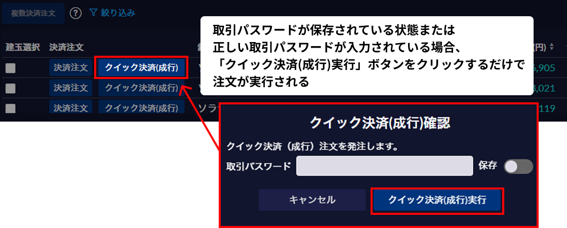 多彩な決済方法で柔軟な取引が可能成行決済や指値決済、逆指値決済、OCO決済、トレール決済、クイック決済と多彩な決済方法があるため柔軟に取引ができ、同一銘柄かつ同一の「売/買」の建玉であれば、まとめて決済することも可能です。クイック決済では、取引パスワードが保存されていればボタンをワンクリックするだけで注文が実行されます。 成行決済