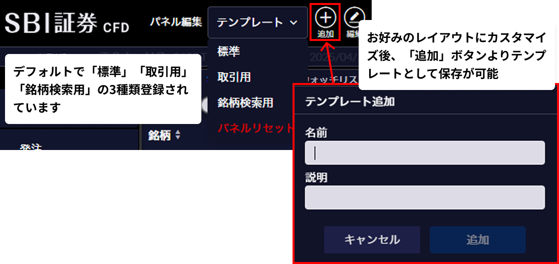 画面を自由にカスタマイズできる画面のレイアウトは、デフォルトで登録されているものに加えて、お客さまご自身で3つまで登録することが可能できます。お客さま一人ひとり、お好みのレイアウトにカスタマイズしてご利用いただけます。