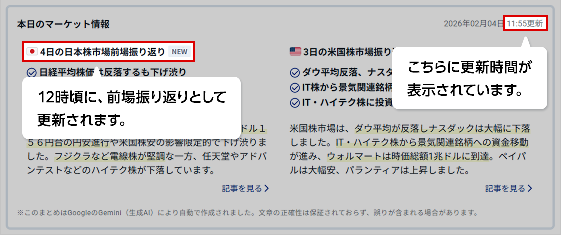 1.本日のマーケット情報内の、日本株市場のまとめが12時頃に更新されます。