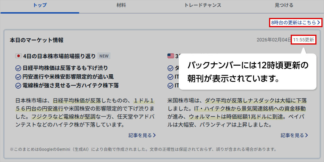 バックナンバーの朝刊は12時頃の更新が表示されるようになります。8時台の更新の日本株市場見通しは、バックナンバーより確認したい日付の朝刊画面上部「8時台の更新はこちら」からご確認いただけます。