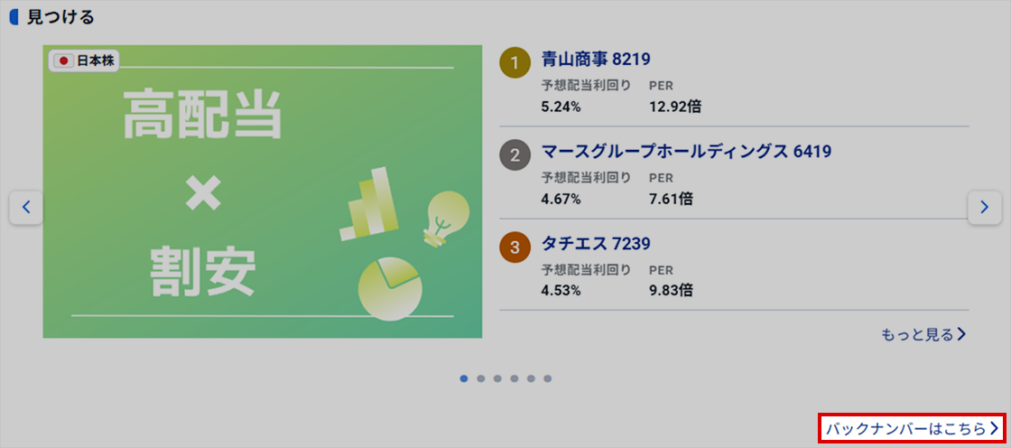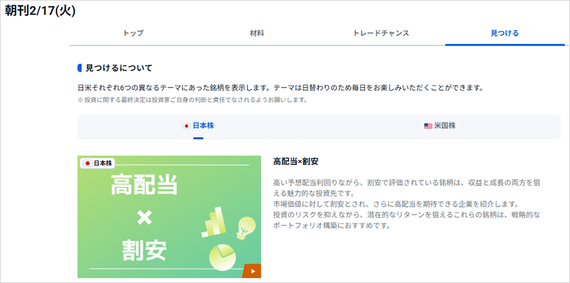 「見つける」 は、初心者の方でも、「閲覧数が多い銘柄」や「高成長銘柄」等、気になるテーマに該当する銘柄を簡単に見つけることができる特集コンテンツです。日米合わせて約40本の特集コンテンツを日替わりで提供しており、銘柄選びに悩まれている初心者の方でも気になるテーマから関連する銘柄を一目で見つけることができます。