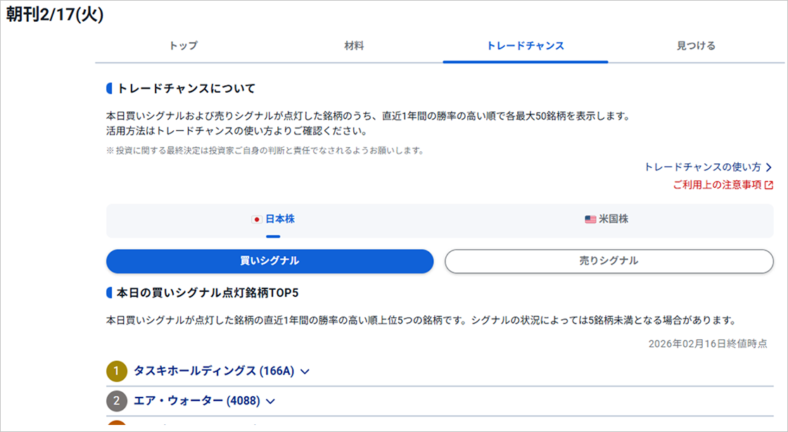 「トレードチャンス」は日米それぞれの株式をテクニカル分析し、買いシグナルおよび売りシグナルが点灯した銘柄のうち、直近1年間の勝率の高い順に各最大50銘柄を表示します。