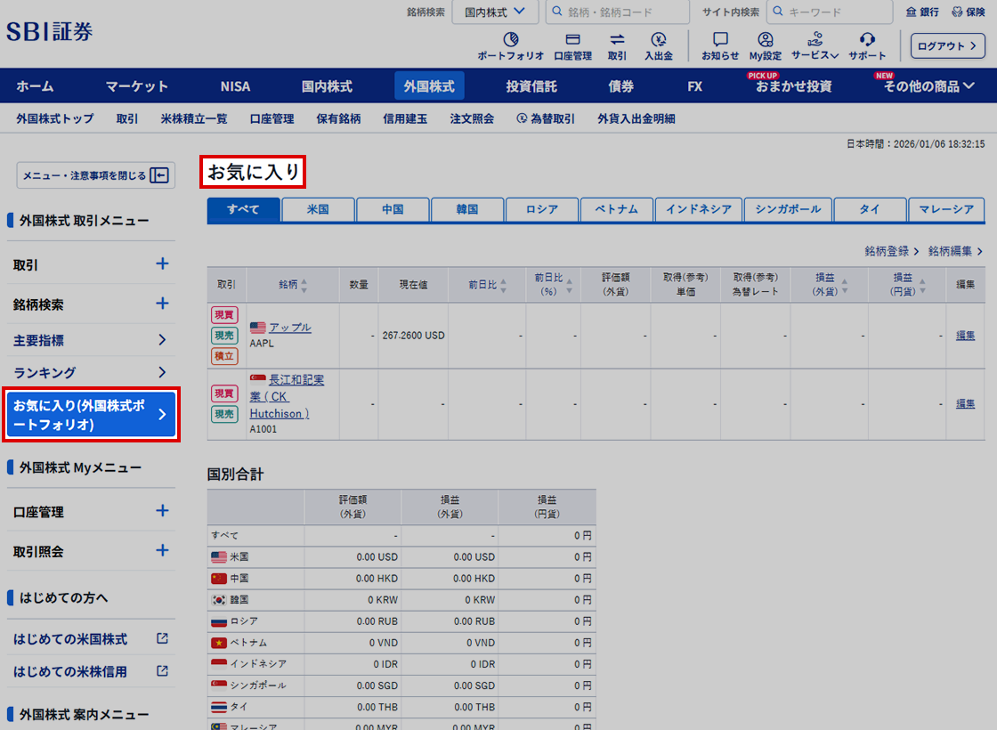 外国株式取引サイト(外貨建商品取引サイト)の「ポートフォリオ」画面は、「お気に入り」に画面名称が変更となります。