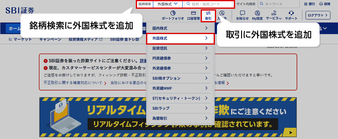 4.「取引」「銘柄検索」内に「外国株式」が追加
