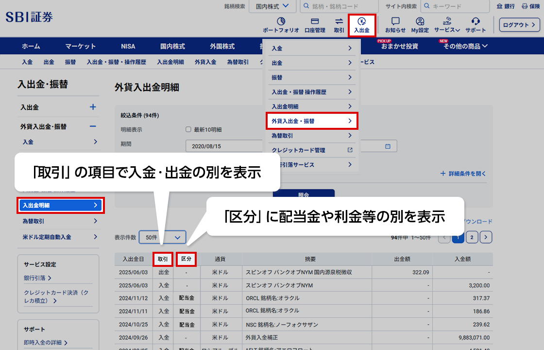 これまで外国株式取引サイト(外貨建商品取引サイト)とメインサイト>入出金画面内にそれぞれあった「外貨入出金明細」を統合します。