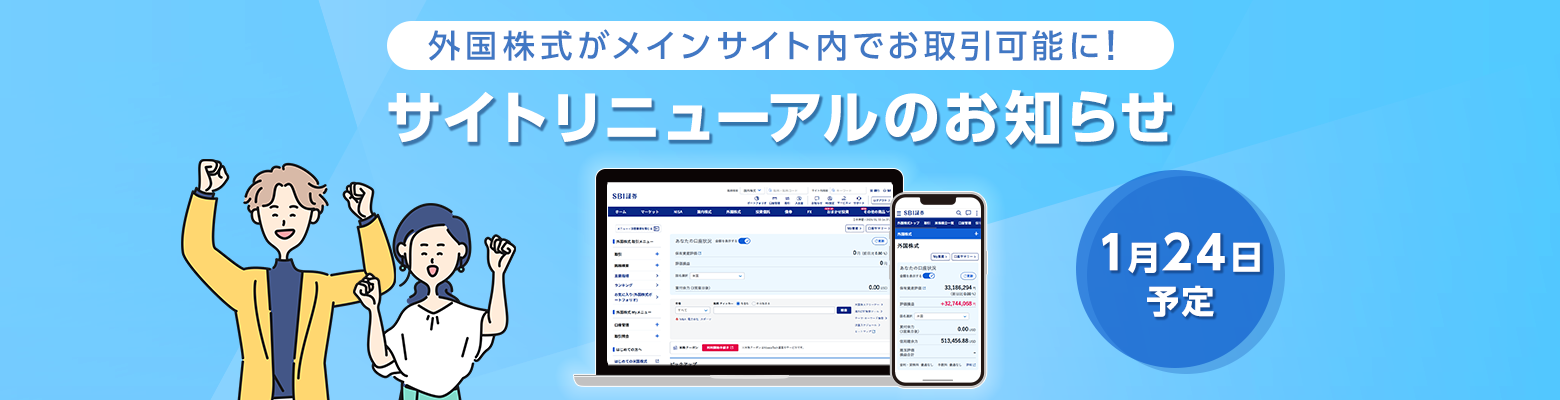 そんな声にお応えして、2026/1/24(土)夜間(予定)に外国株式取引サイト(外貨建商品取引サイト)をリニューアル!外国株式がメインサイト内でお取引できるようになります。使いやすくなった外国株式ページをぜひご活用ください。
