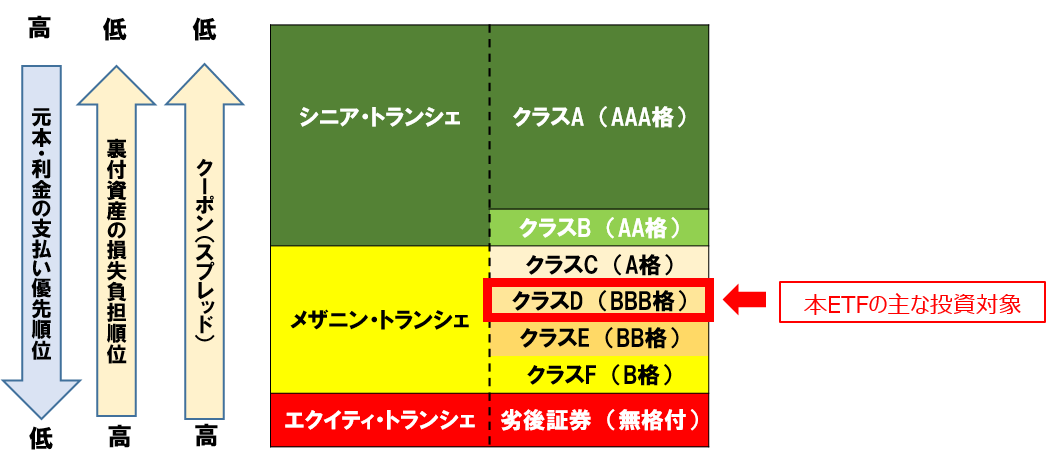 投資家はAAA〜BB格、無格付のエクイティ部分など、リスクに応じた階層(シニア債・メザニン債など)を選べます。