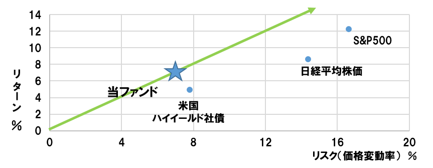 良好なリスク・リターンの特性:シャープレシオ(=リターン/リスク)が、1を超える運用商品(緑色の矢印線 、上表 赤枠部)は、 優れたリスク・リターンの特性を持ち、長期保有に適していると考えられる。