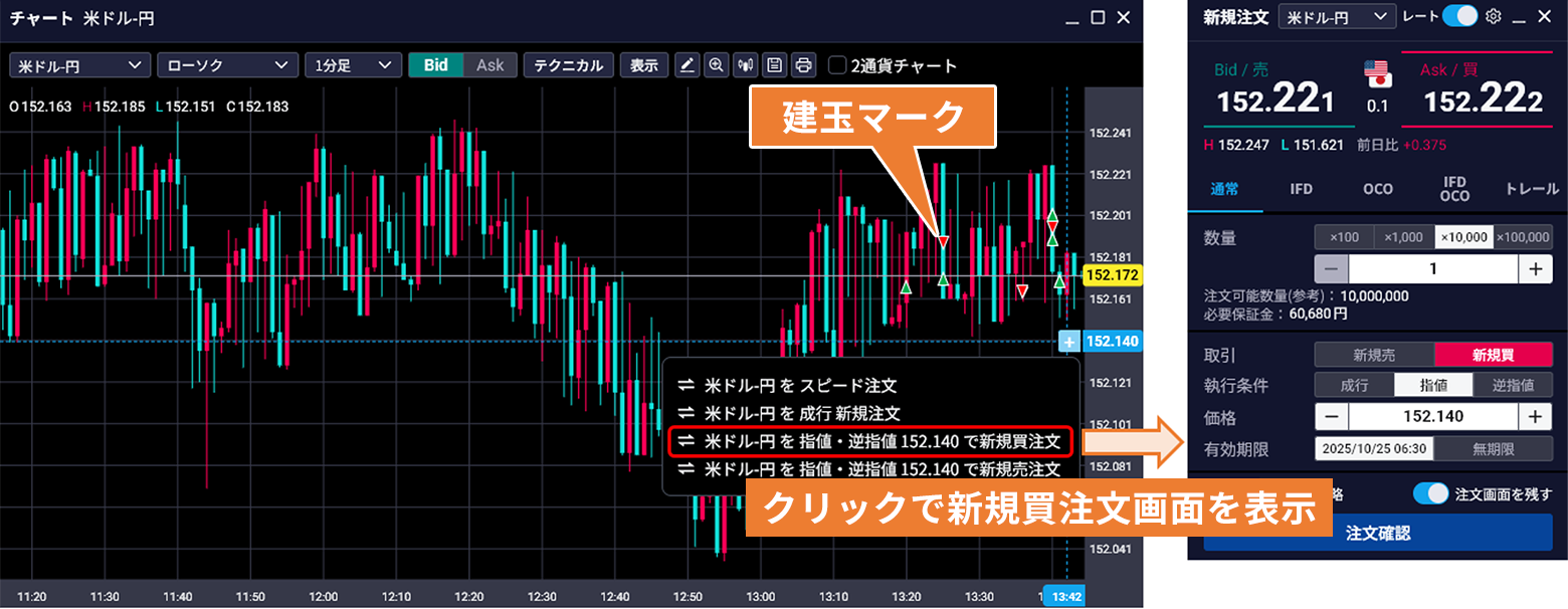 建玉マーク表示機能とチャート上からの注文画面への遷移イメージ