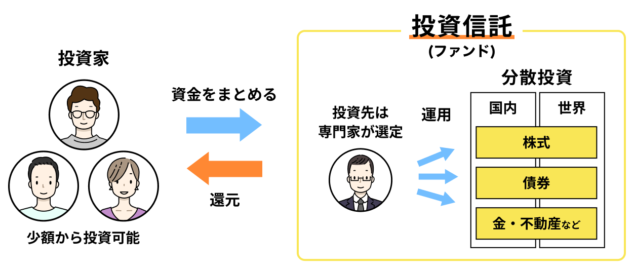 そんなときに頼れるのが、「投資信託」という仕組みです。投資信託なら、プロがたくさんの企業や商品に分けて運用してくれるので、1つの商品を買うだけで、いろんな資産や地域に分けて投資できるのが大きな特長です。