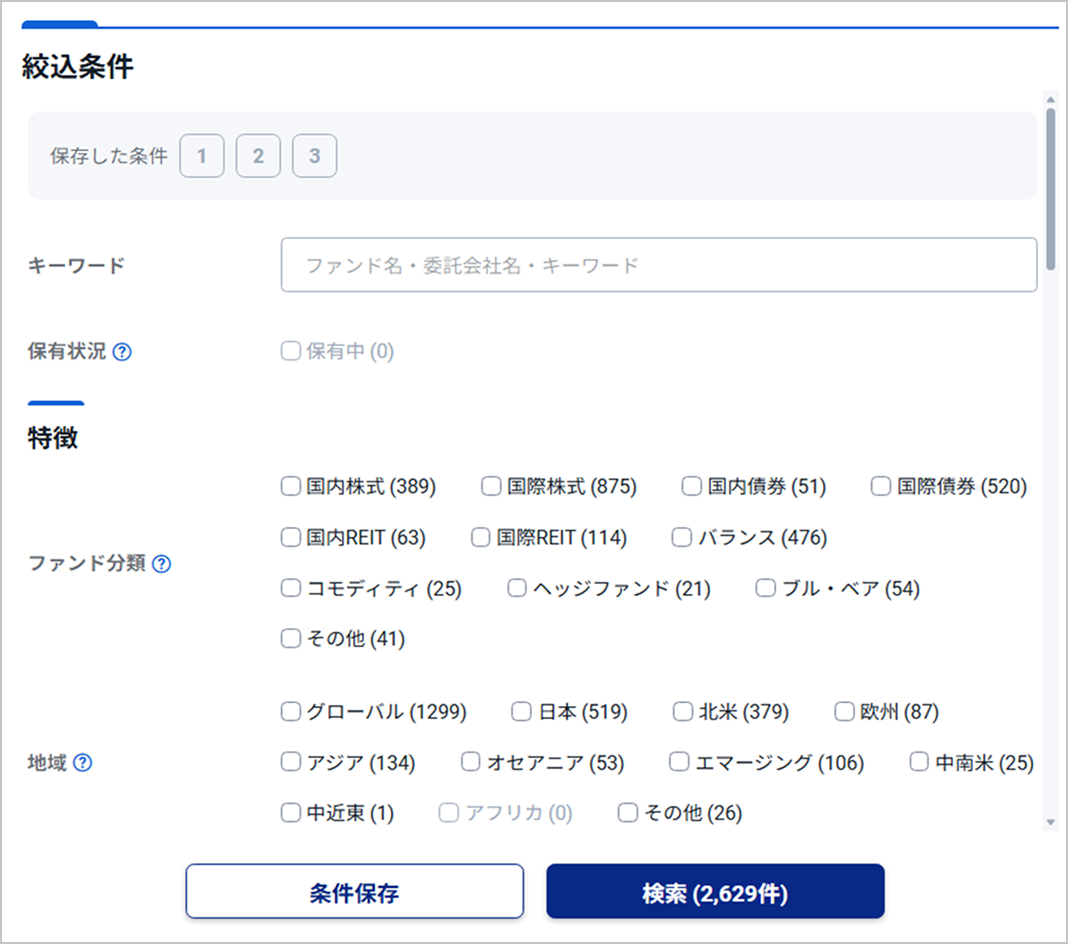 この機能は、数多くある投資信託の中から、自分のニーズに合うものを効率的に探すことができる便利なツールです。キーワード検索に加え、詳細な絞込条件を設定することで、初心者から経験者までご自身のニーズに合った投資信託を見つけるサポートをしていきます。