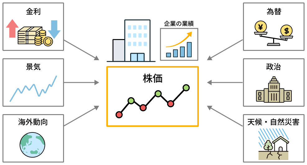 ただし、そのほかにも景気や政治・金利・為替・海外動向・天候・自然災害など、さまざまな影響を受けて、株価は日々動いています。