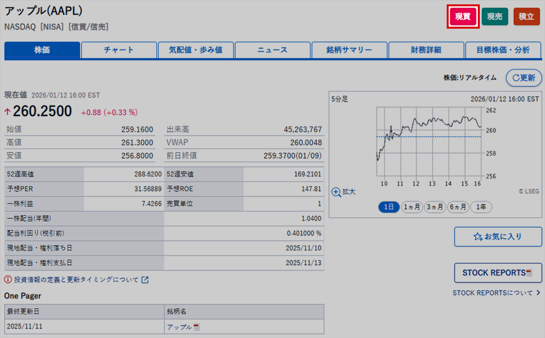 銘柄詳細画面の右上にある 「現買」 をクリック