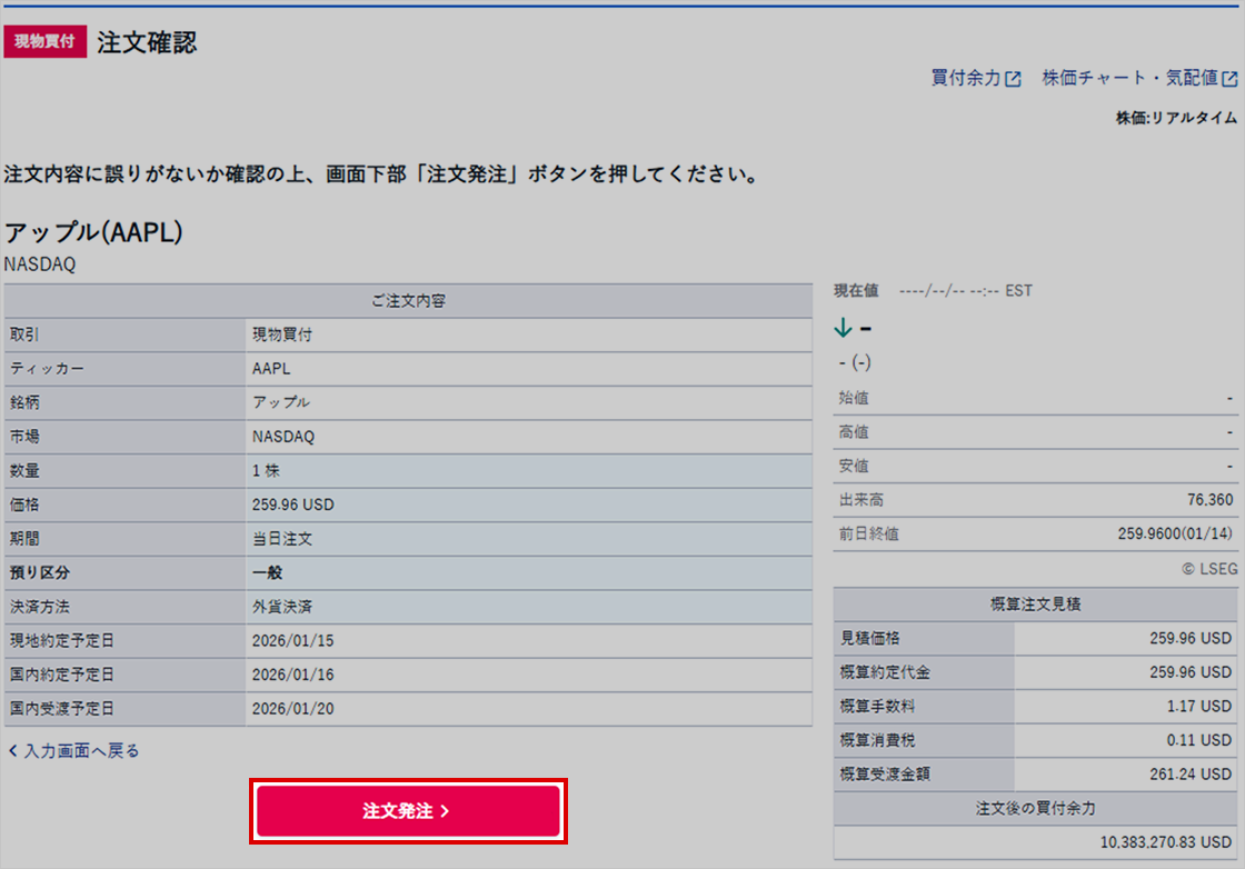 注文内容を確認し、相違なければ「注文発注」をクリック