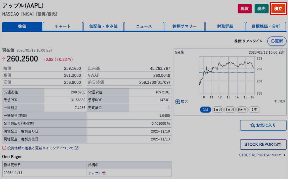 銘柄詳細画面の右上にある「積立」をクリック