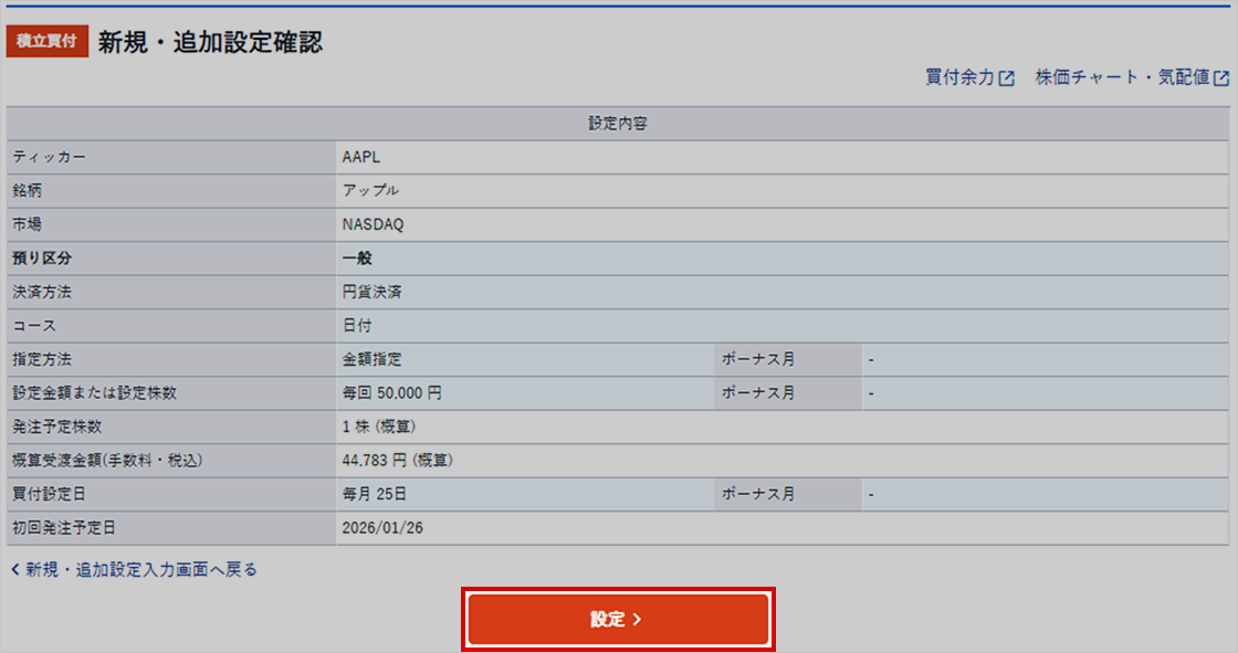 注文内容を確認し、相違なければ「設定」をクリック