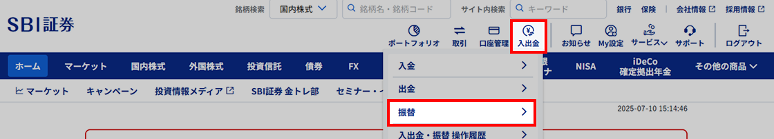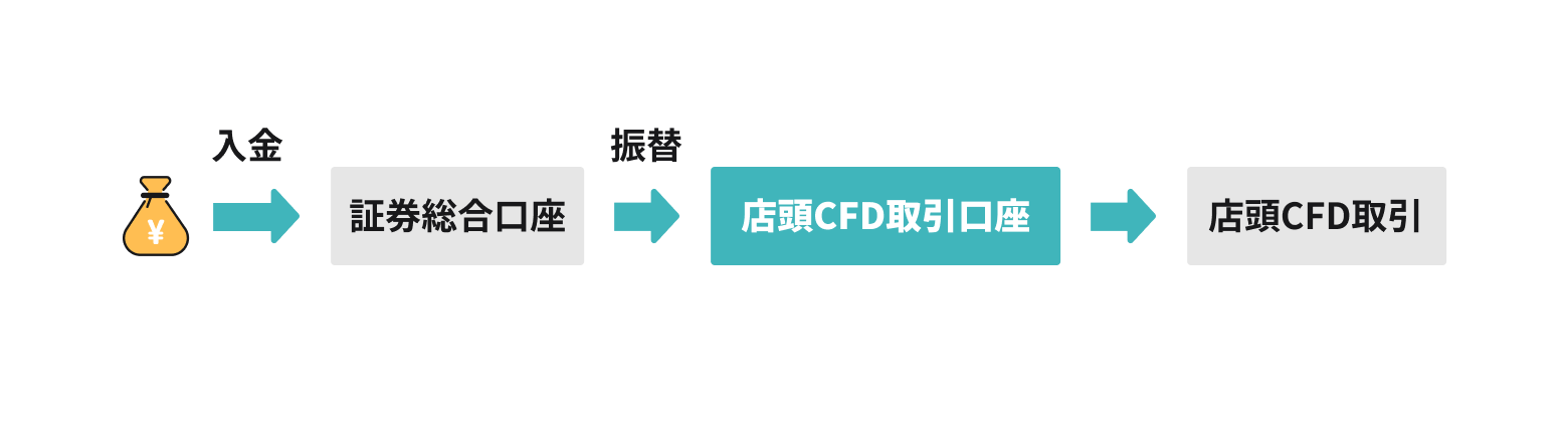 「振替指示」画面で、証券総合口座から店頭CFD取引口座へお振替いただくと、1〜2分でお取引が可能となります。店頭CFD取引口座の開設後にお手続き可能です。ログイン後、「入出金・振替」ボタン>「振替」ボタンをクリックし、振替入力画面へ進んでください。