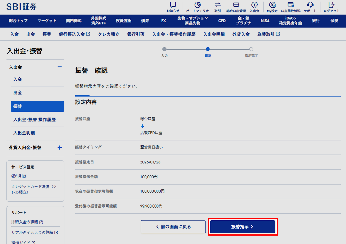 振替確認画面で、内容を確認し「振替指示」ボタンをクリック