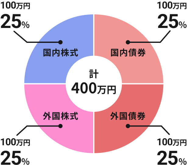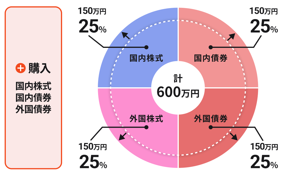 新たに100万円の資金を追加し、国内株式・国内債券・外国債券を購入して、それぞれが150万円(25%)になるようポートフォリオを再構築