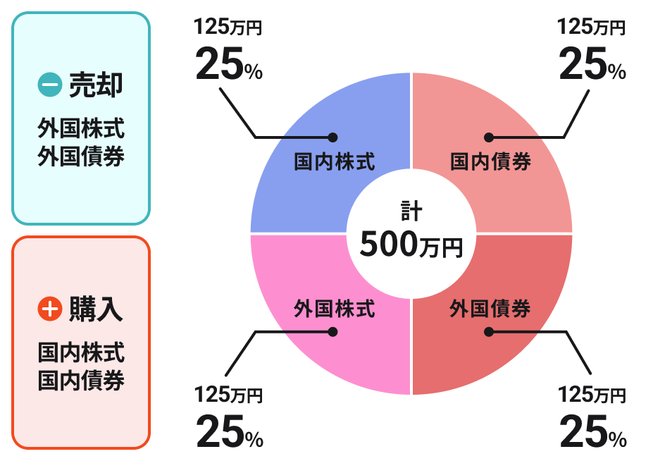 外国株式・外国債券を売却、国内株式・国内債券を購入して、それぞれが125万円(25%)になるようリバランス